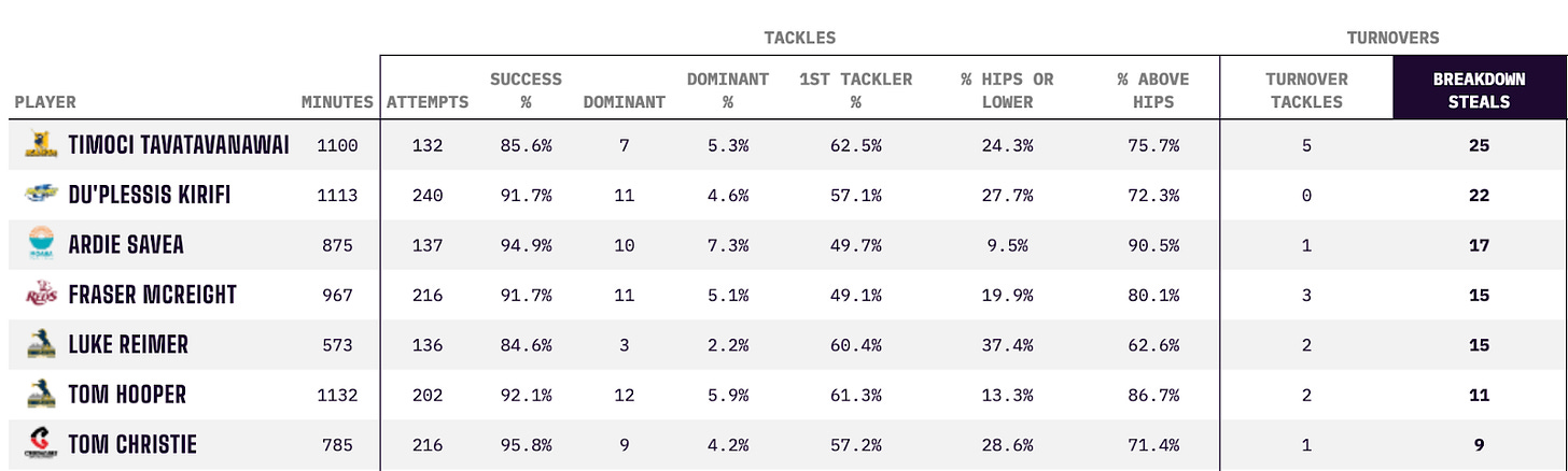 Breakdown steals also appear to be a key area of focus, with two debutants, Tavatavanawai and Kirifi, leading the way in this regard in Super Rugby this year, along with the ever-reliable Ardie Savea.