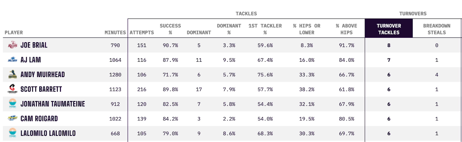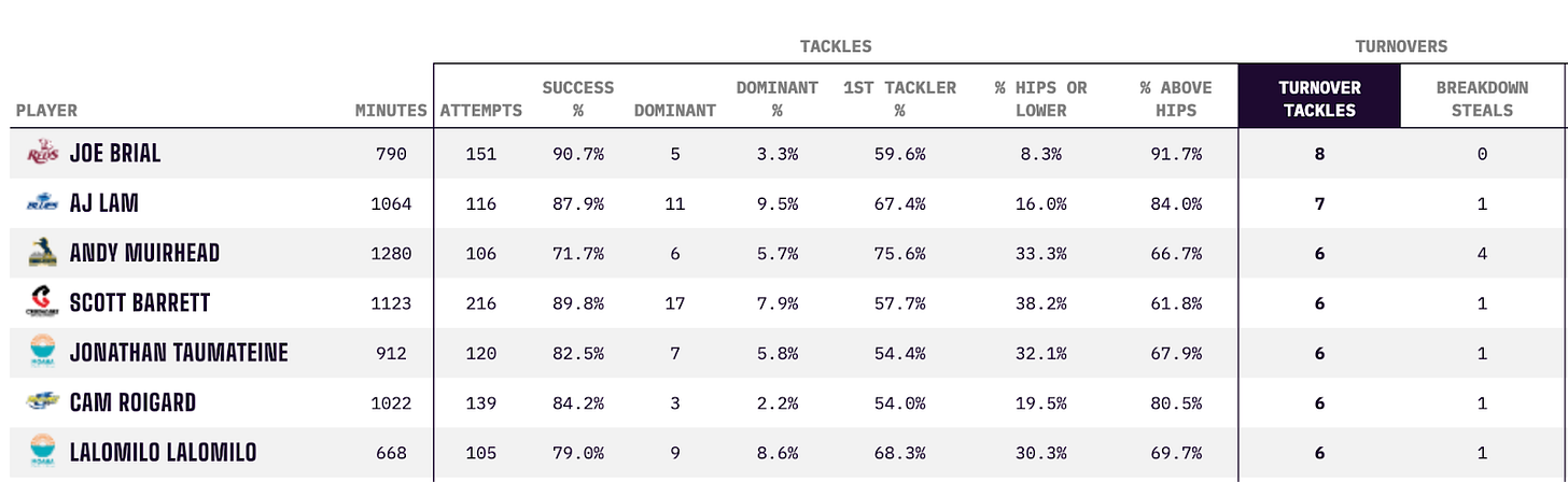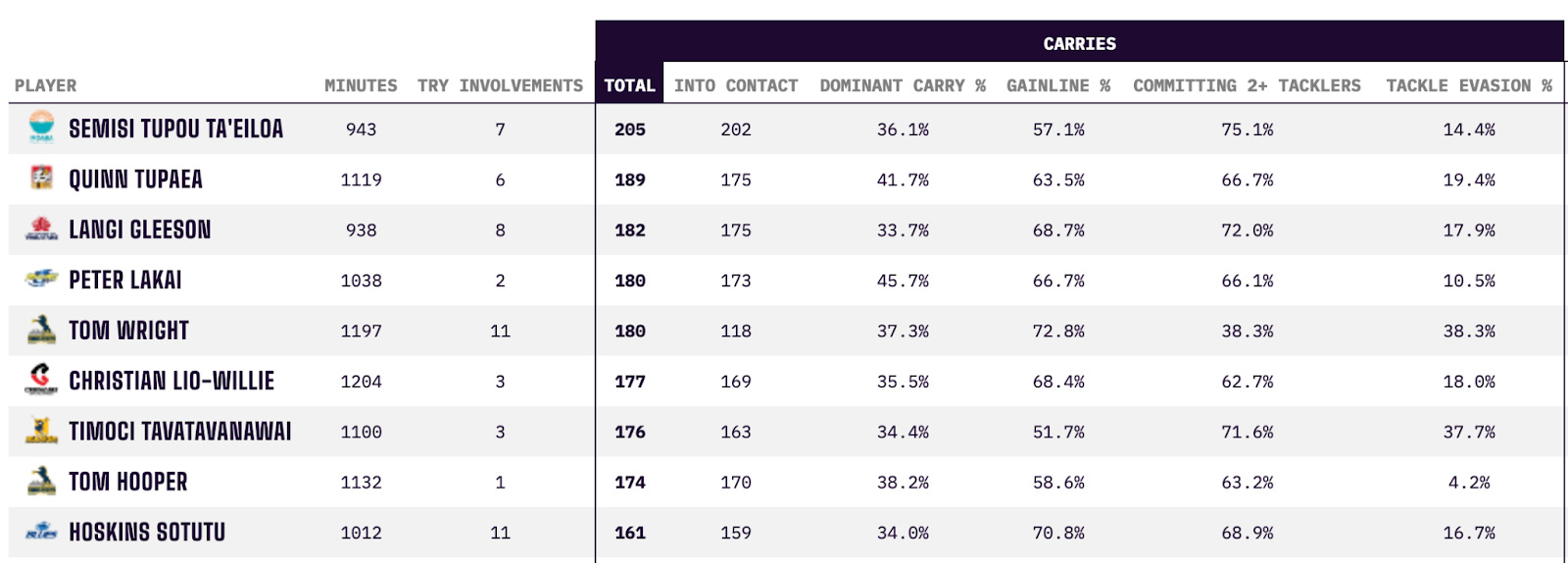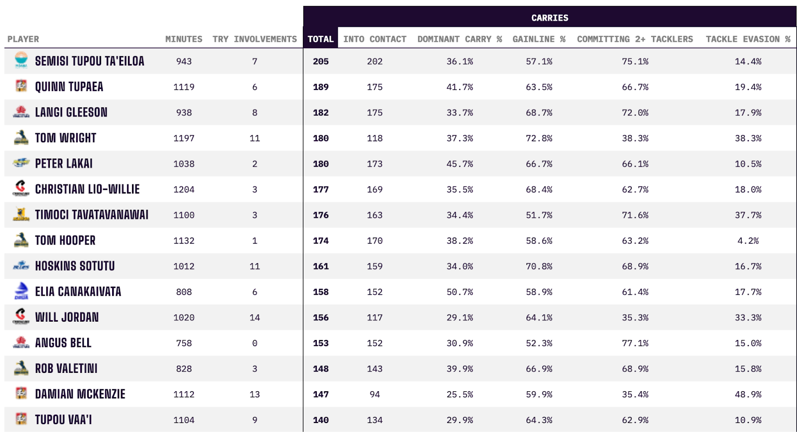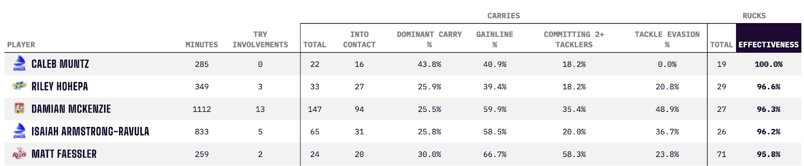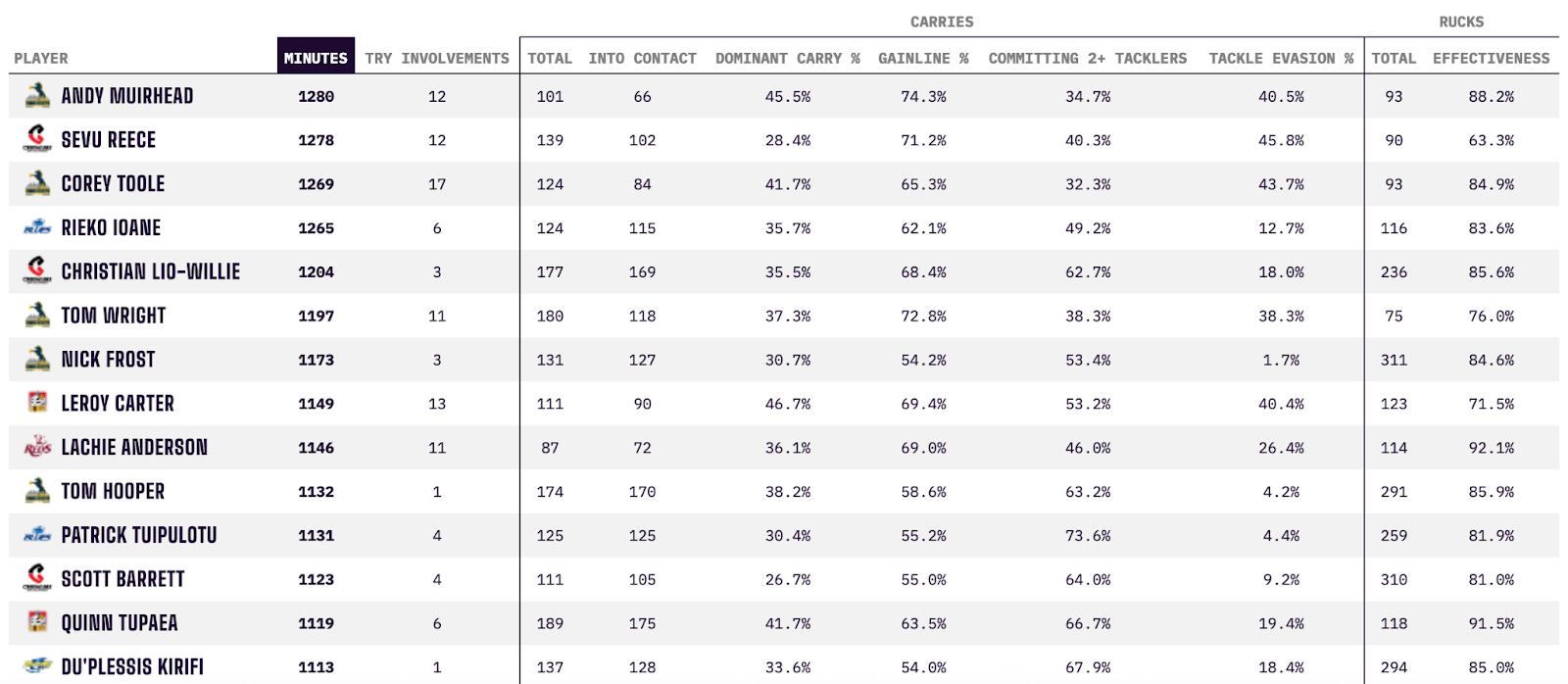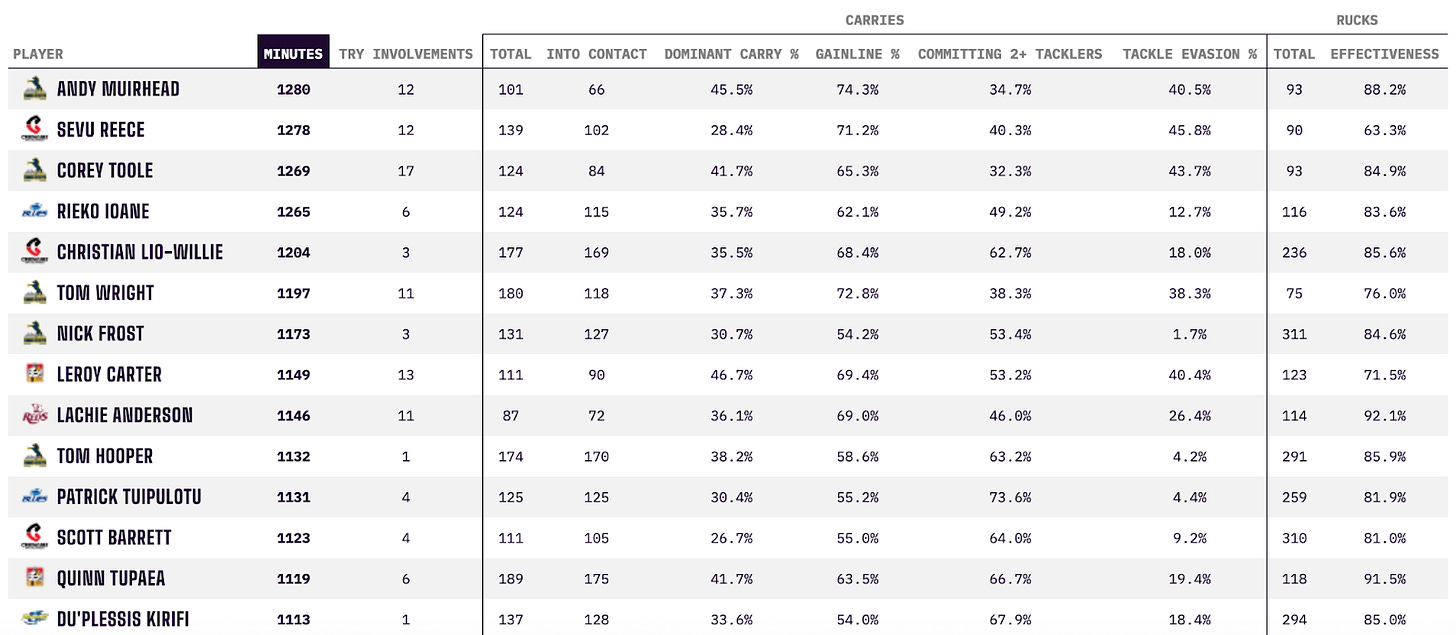 Defensive ruck work may well have been one of the key selection criteria, as Tavatavanawai also ranks very highly (7th) by this measure, while also ranking 7th for total carries, 1st for breakdown steals, and committing two or more tacklers at a rate of 70+%.