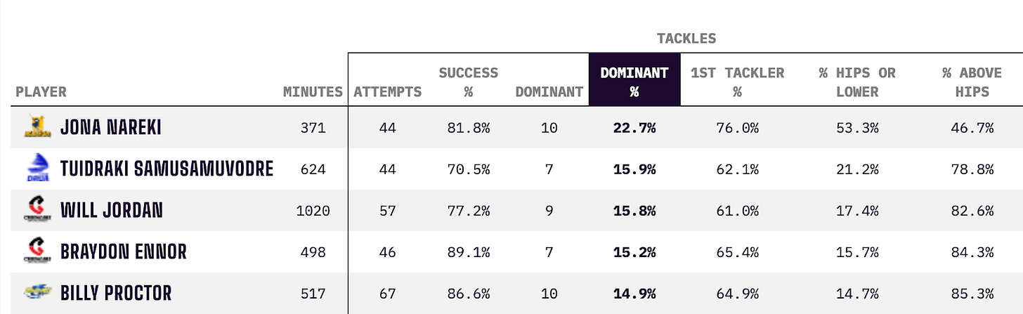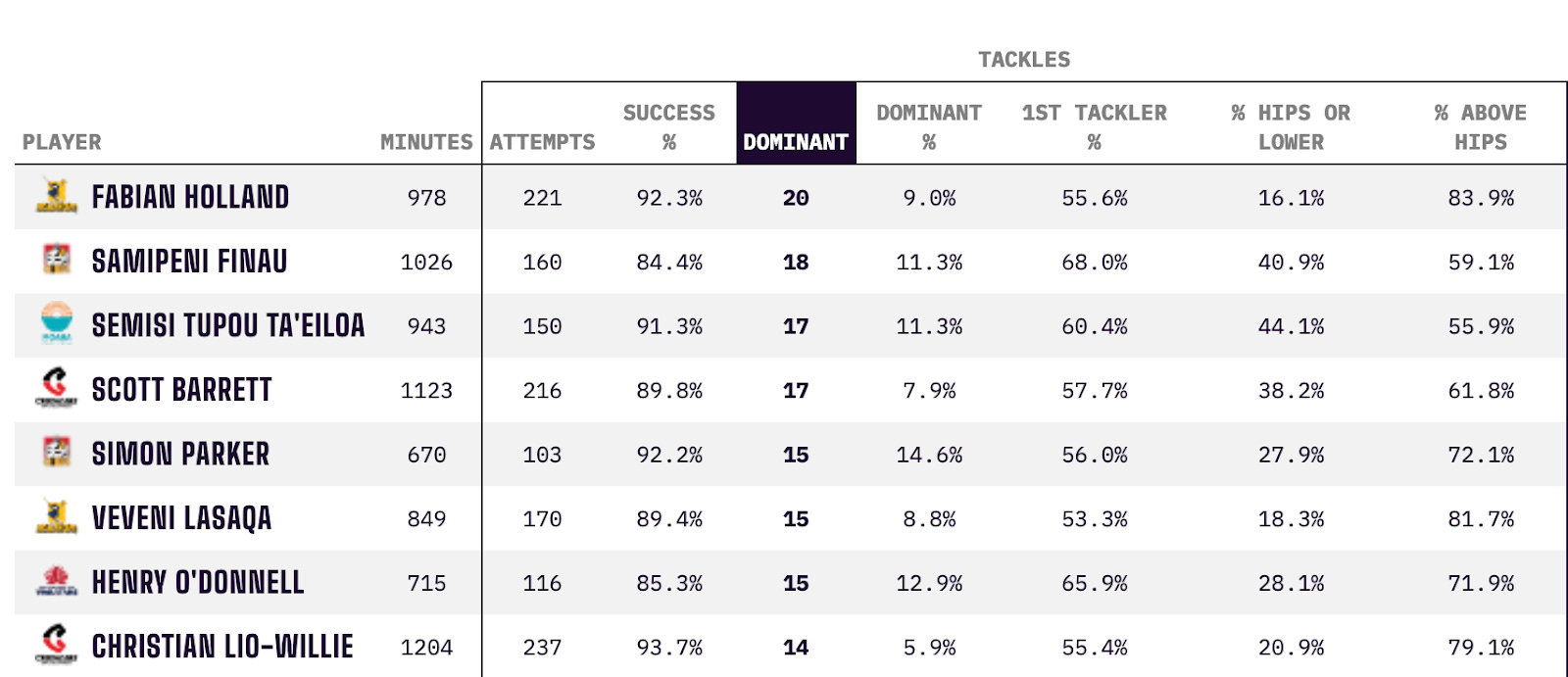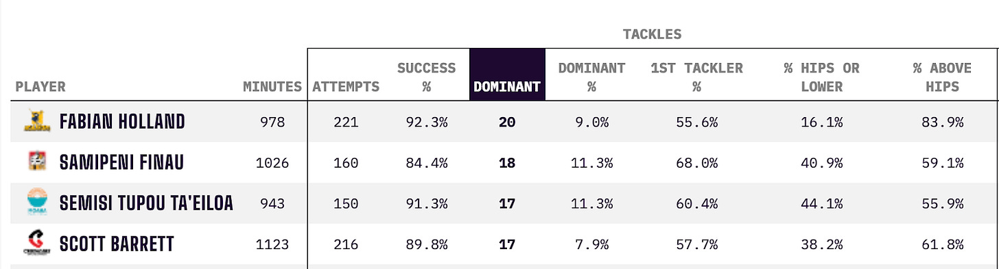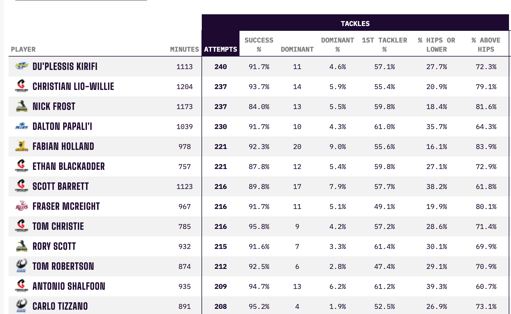If we look at dominant tackles, Lio-Willie and fellow loose forward Samipeni Finau both rank highly, as do locks Scott Barrett and Fabian Holland. Simon Parker, who some thought might have been close to making this squad, also pops on this metric and several others. He’s one to keep a close eye on (as is Riley Higgins, on a totally unrelated note, but it’s worth harping on).