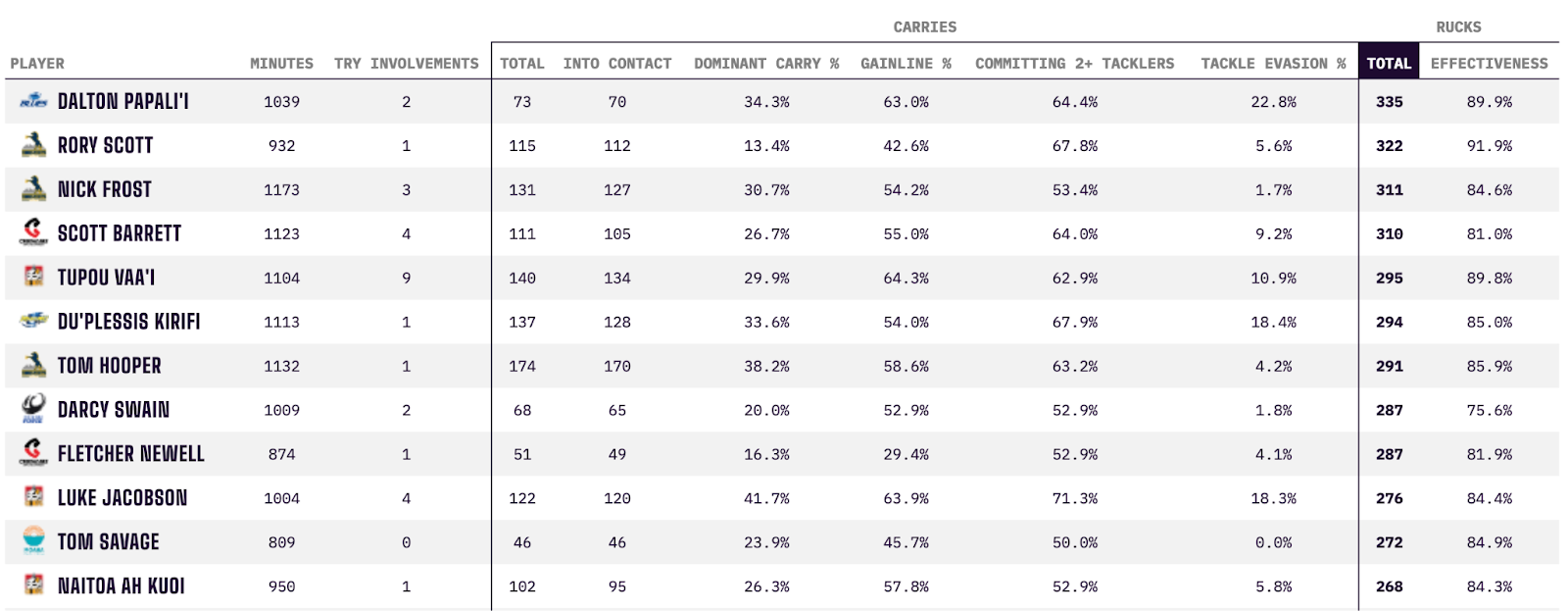If we look at total attacking rucks hit, Dalton Papali’i, who was a notable exclusion from this squad, ranks at the top, but behind him, Barrett, Vai’i, Kirifi, Newell, Jacobson, and Ah Kuoi (who has recently been training with the squad) all rank highly.