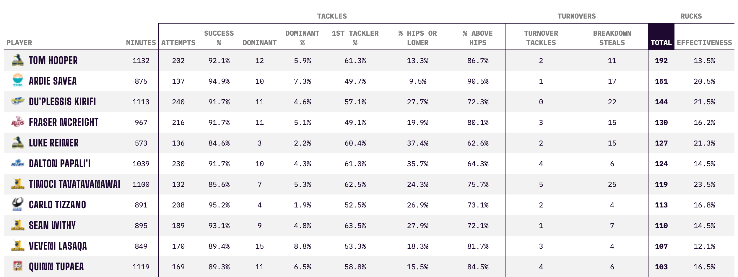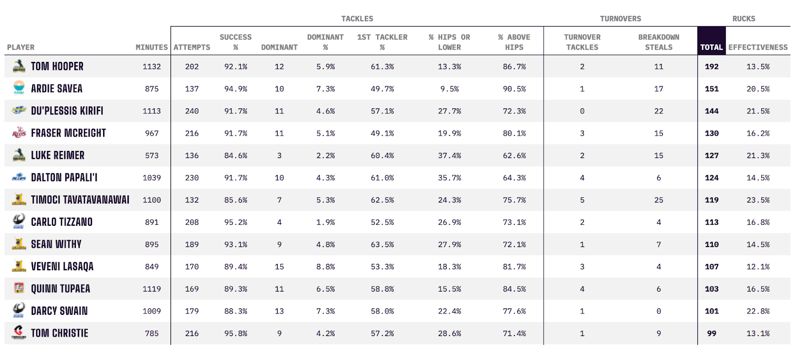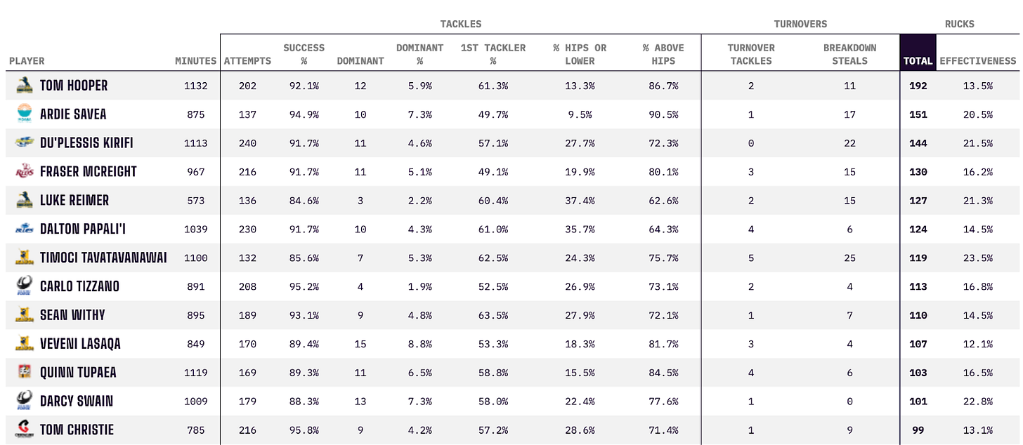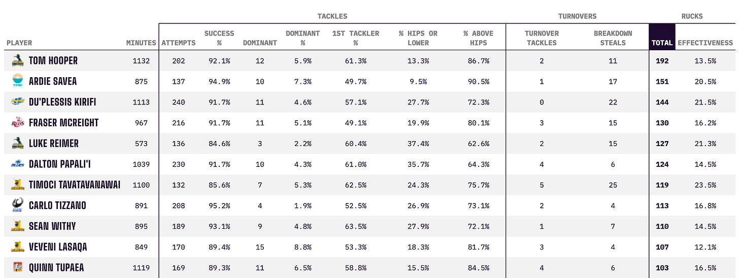 Of course, all of these things mean little if your loose forwards get dominated at the breakdown, so it is heartening to see Savea and Kirifi (as well as midfielders Tavatavanawai and Tupaea) ranking among the top three for total defensive rucks hit in Super Rugby 2025