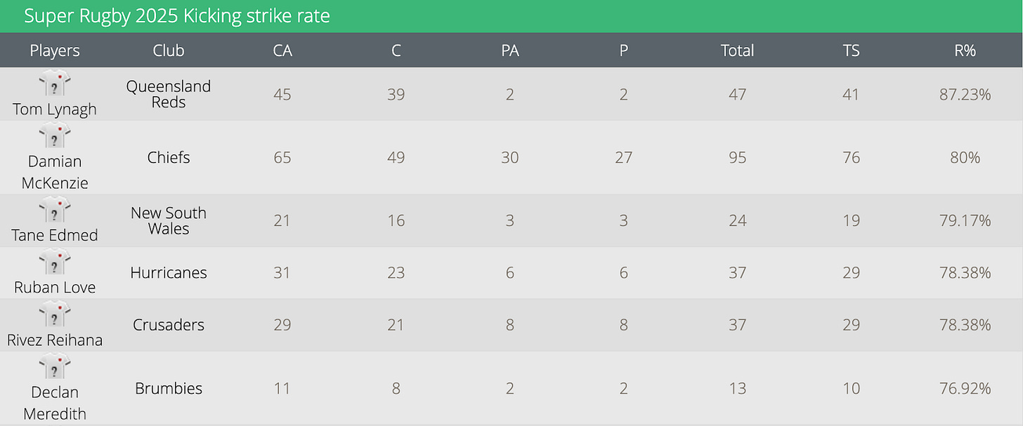 Lineout and scrum stats (particularly individual throwing success rates for hookers and scrumming success rates for props) are more difficult to come by. Still, in terms of raw lineout win percentages in Super Rugby 2025, the Crusaders (2nd) and Chiefs (6th), who contribute all three squad hookers, both fare solidly, remembering that a variety of factors, and not just the hooker’s throwing, can influence these numbers.