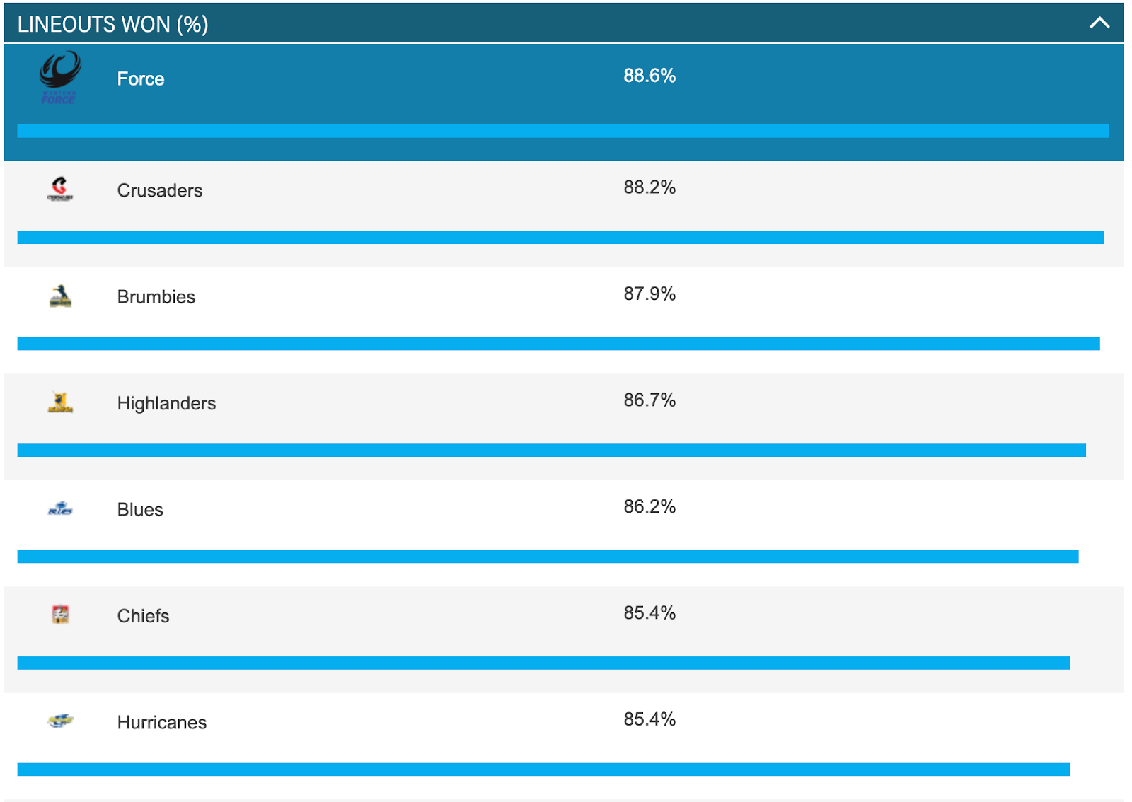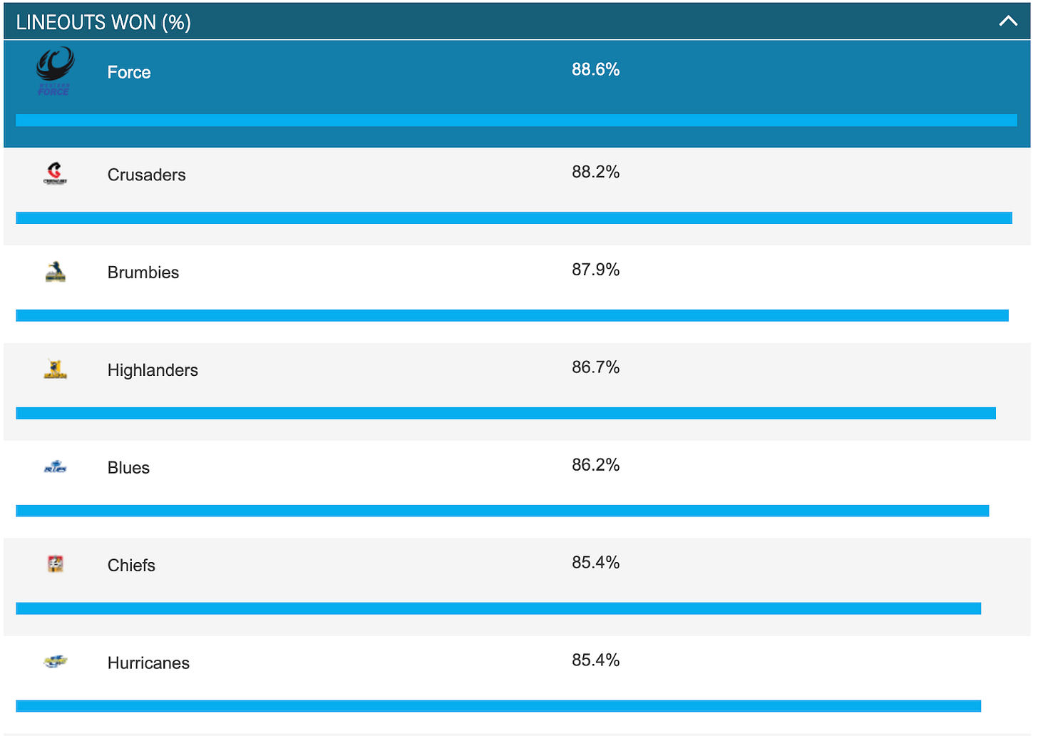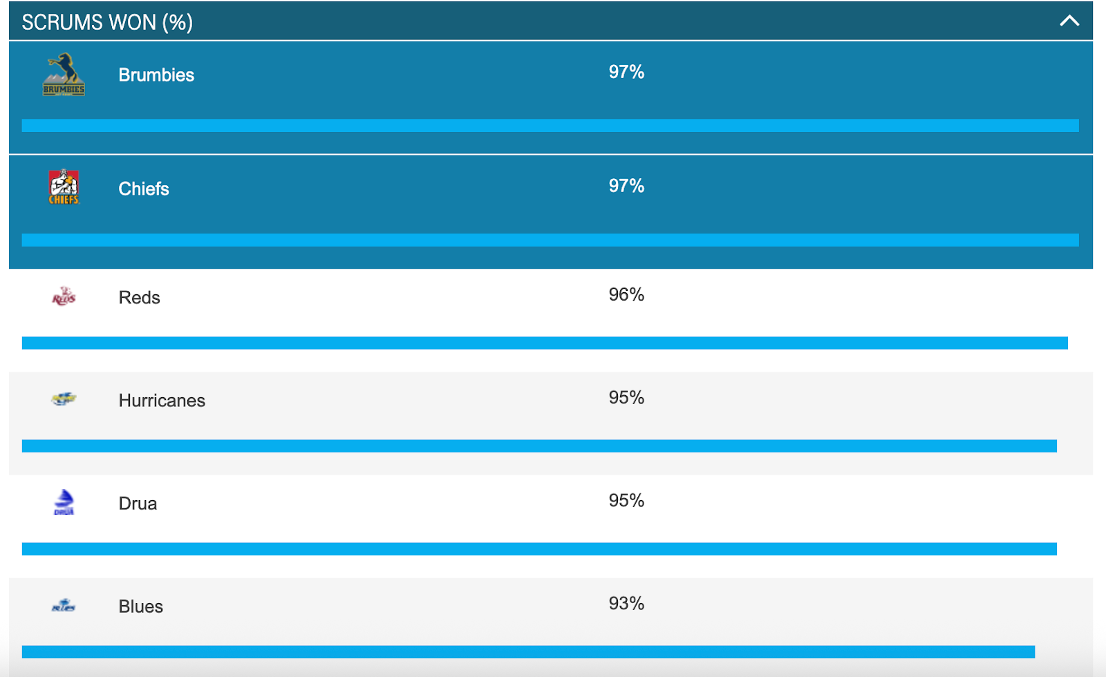 In terms of scrum win percentages, the Chiefs (first equal) and the Hurricanes (third), who contribute four of the six squad props between them, both held up well.