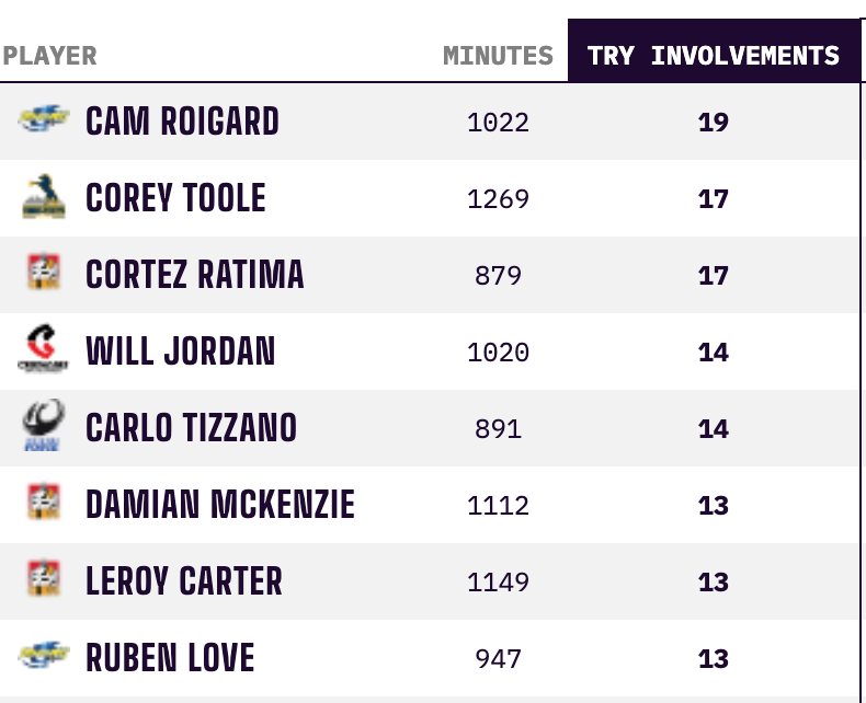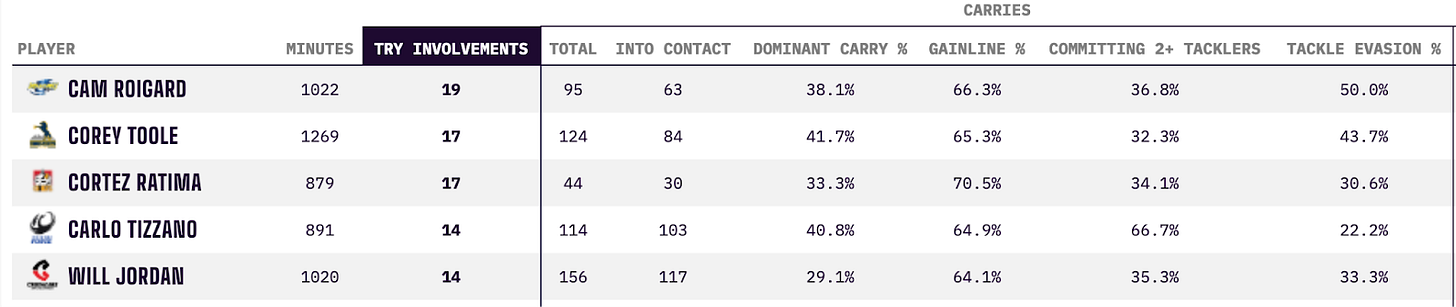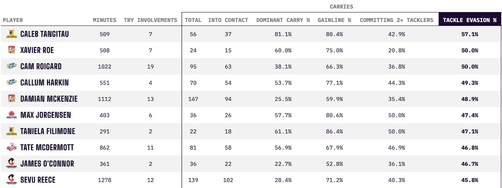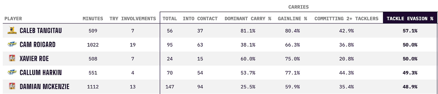 You will also find that Roigard is the second most evasive player in Super Rugby, behind only Caleb Tangitau, with Damien McKenzie, unsurprisingly, also excelling by this metric.