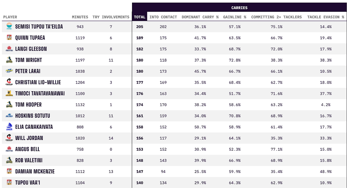 Moving on to Tupaea and Tavatavanawai, both have been rewarded for supreme, all-court statistical dominance. In Super Rugby 2025, Tupaea ranked second for total carries, second for carries into contact, eighth equal for dominant tackles, ninth equal for breakdown steals, 11th for total defensive rucks hit, and was one of only 13 players to hit 100+ attacking rucks with a 90+% success rate. Of the top 15 carriers by volume in Super Rugby this year, only Peter Lakai and Elia Canakaivata had better dominant carry percentages than Quinn Tupaea.