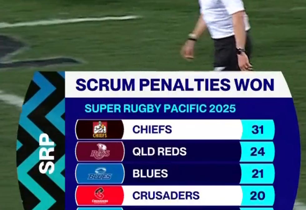 There was also this notable statistic that popped up on screen during the Super Rugby final, showing that the Chiefs’ scrum had won by far the most penalties in Super Rugby this season—seven clear of the Reds in second place—providing further insights into Norris and McAlisters’ selections.