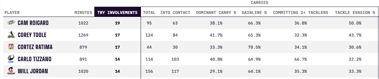 Will Jordan offers a more balanced mix of everything. He ranks 4th for try involvements, 11th for total carries, and also gets busy at the breakdown, hitting 91 attacking rucks and 36 defensive rucks.